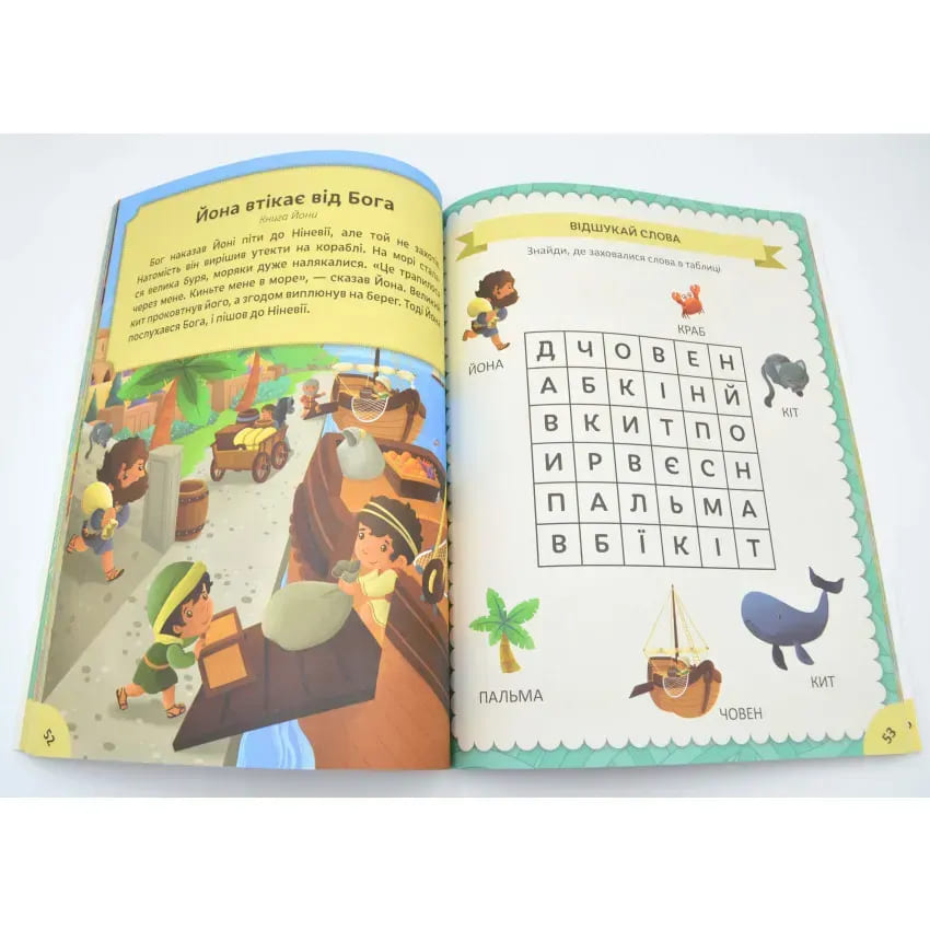 Формат: 250х250Коли ваша дитина попросить розповісти їй якусь історію, не вагаючись візьміть цю книжку. Тут є аж 52 історії зі Старого та Нового Завітів. Слухаючи або читаючи їх, легко уявити себе поряд із героями цих оповідок. Авжеж! Доступні для дитячого сприйняття тексти і вигадливі ілюстрації не дають відірватися від книжки.Як ви зрозумієте, чи зацікавила дитину щойно прочитана історія? Це просто – вона засипле вас запитаннями! Тоді запропонуйте їй послухати ще й біблійні уривки, вказані після кожної назви історії. Можна також попросити дітей, щоб вони пояснили, як розуміють найважливішу думку, яку в кожній історії виділено жирними літерами.Це чарівна книжка. Під час читання ви побачите вашу дитину серйозною і веселою, замисленою і готовою фантазувати. Ви відкриєте їй предивний світ Біблії, у який вона захоче повертатися знову і знову.