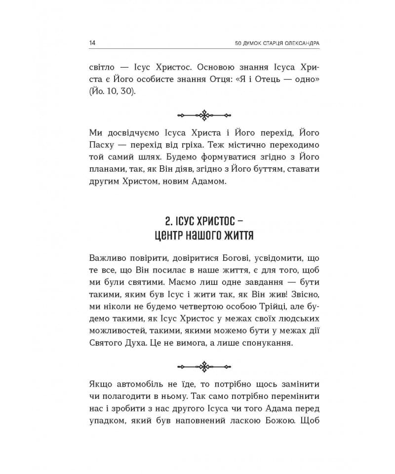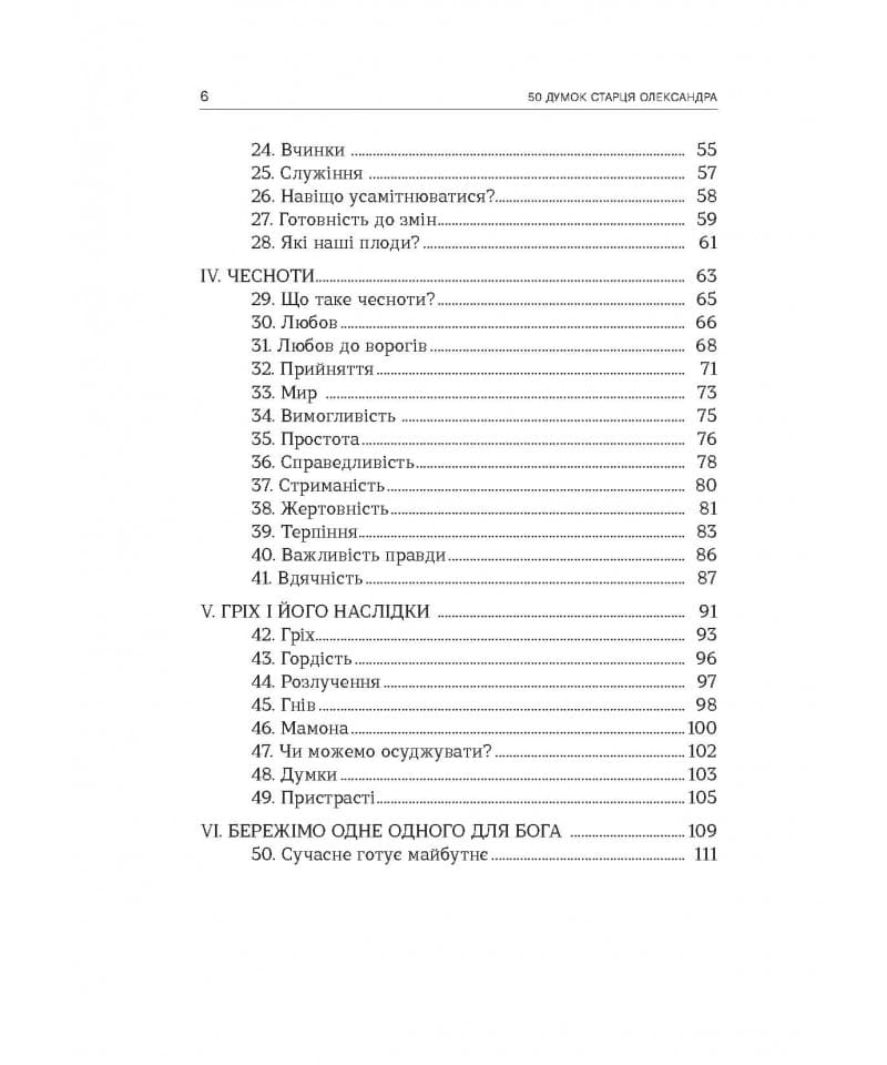 «50 думок старця Олександра» – це витяги зі записів схимонаха. Вони сформовані у шість розділів, що висвітлюють осмислення головних християнських істин, духовне життя, співпрацю людини з Богом, сутність чеснот, аналіз гріха і його наслідків, а також важливість усвідомлення того, що майбутнє залежить від того, яким є сьогодення.