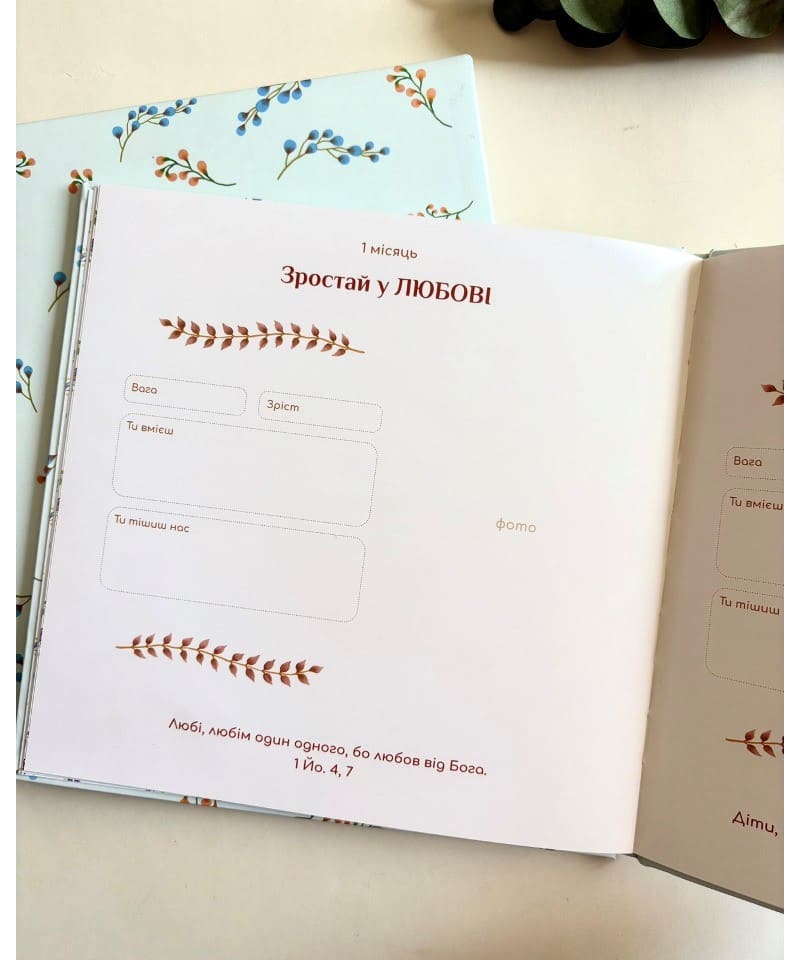 У альбомі ви також знайдете цінні поради та біблійні цитати для християнського зростання у вірі. Є окремо виділена сторінка, .де батьки чи хресні зможуть записати свої побажання для дитини.