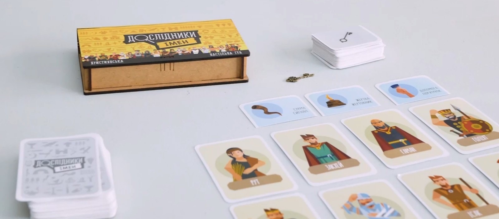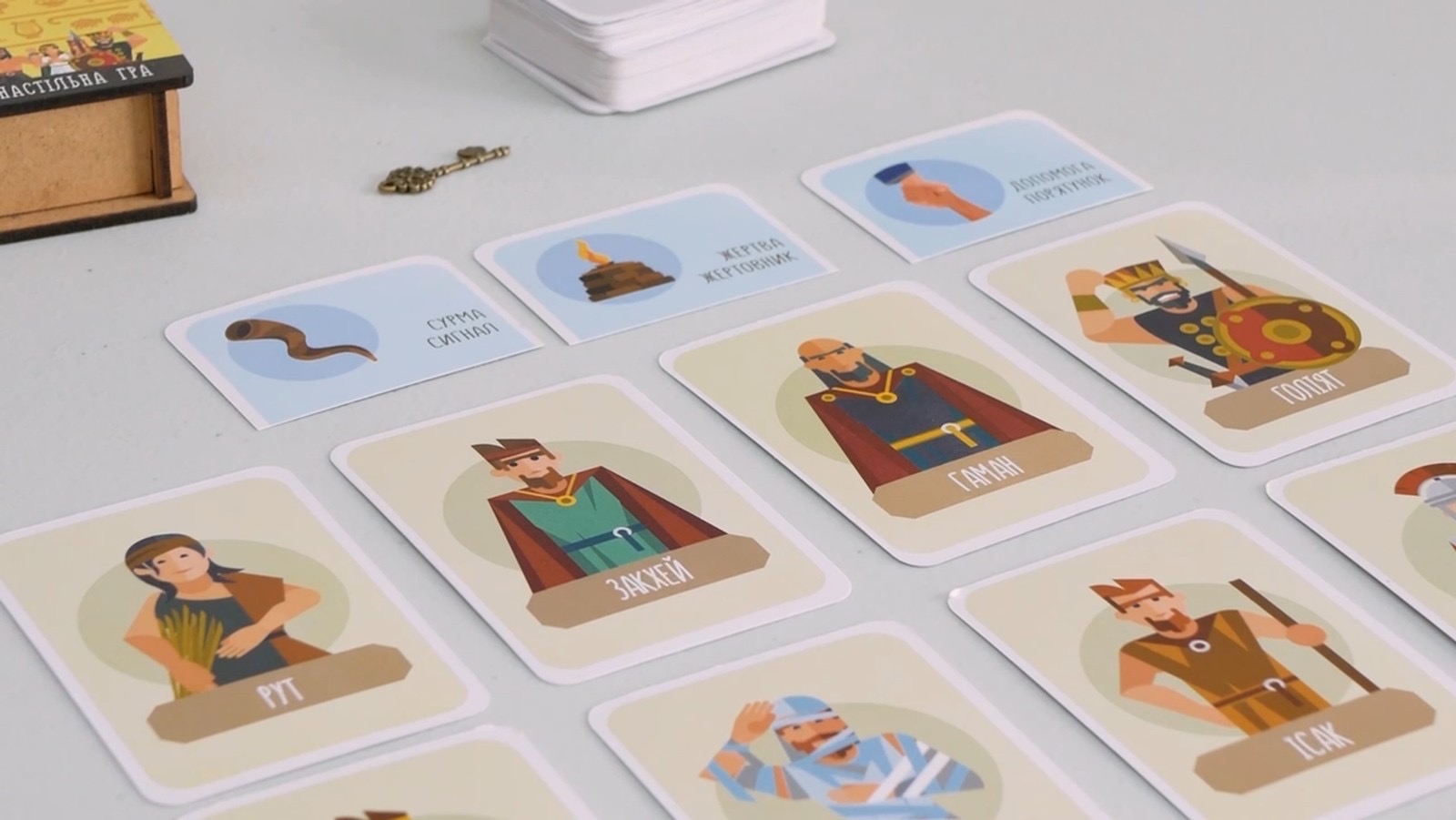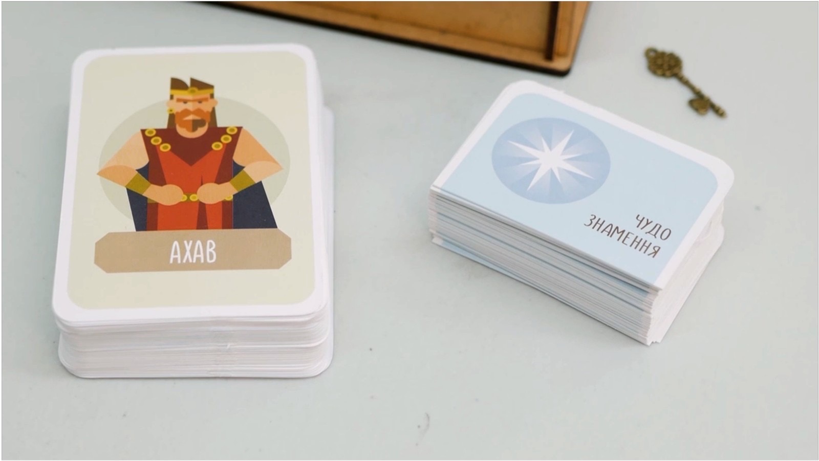 *«Хронологія»* Гра допомагає вивчити приналежність і розташування книг Біблії, тренує пам’ять, розвиває логіку та вміння працювати в команді. Гра складається з 66 двосторонніх карток: - 1 сторона містить ілюстрації до книги та її назву; - 2 сторона містить: • назву книги (за перекладом Огієнка), • назву попередньої і наступної книг, • приналежність до Старого чи Нового Заповіту, • порядковий номер книги в Біблії, • кількість розділів, • тип книги (історична, пророча, поетична тощо), • автора книги (з можливою похибкою), • орієнтовну дату написання, • короткий зміст книги.