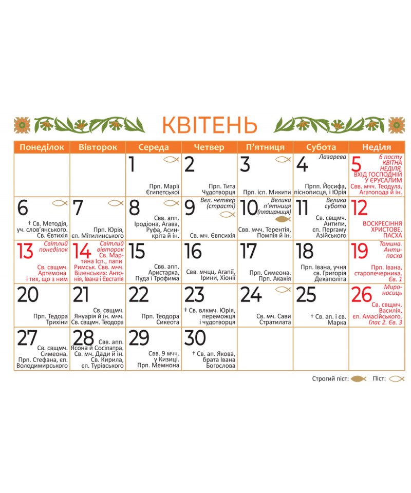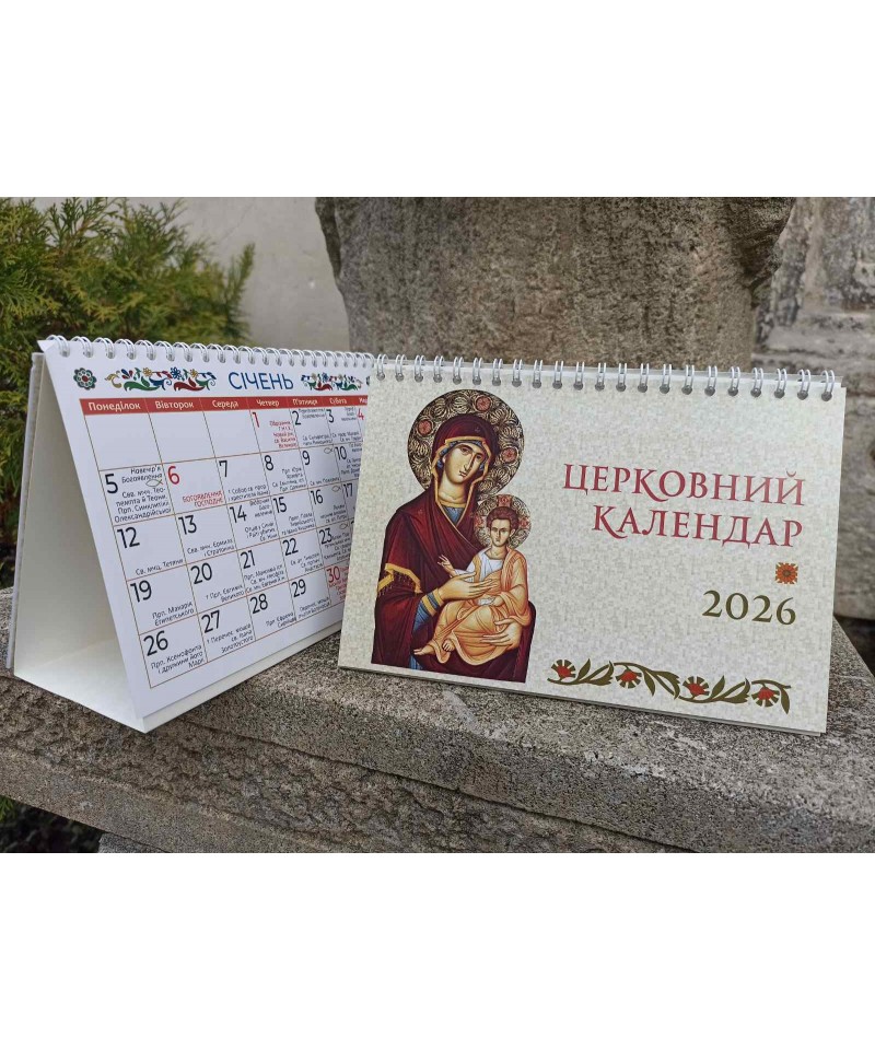 Цей календар можна розмістити на робочому столі чи будь-якій полиці. В ньому позначені церковні празники, постові дні, а також виписані дати популярних іменин. Виразна календарна сітка з великими цифрами.