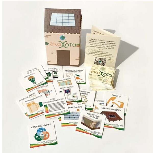"ЕкоХата" – це розвиваюча гра для віку 7+, розрахована на 2-8 гравців, тривалістю 20-30 хвилин. Вона включає 36 карток.Місія: Збираючи пари карток, гравці вивчають підказки про енергоефективність та енергозбереження в домі, щоб перетворити його на "ЕкоХату" – екологічно дружнє житло.Підготовка: Ознайомтеся з картками, на яких зображені відновлювані джерела енергії та енергоефективні прилади.Початок: Перемішайте 36 карток і розкладіть їх зображенням донизу в 6 рядів по 6 карток. Хто починає гру – вирішують гравці.Хід гри: Гравець перевертає дві картки. Якщо зображення збігаються, він забирає пару і робить наступний хід. Якщо зображення різні, картки повертаються на місце обличчям донизу, і хід переходить до наступного гравця за годинниковою стрілкою.Пам'ятайте: Запам'ятовуйте розташування карток, які не збіглися.Перемагає той, хто збере найбільше пар карток.