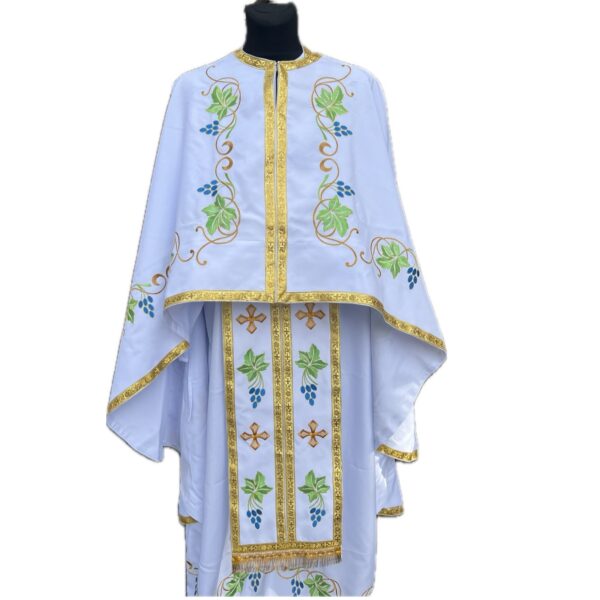 Ризи ієрейські 006758 вишиті, білий габардин з синім виноградом VOV