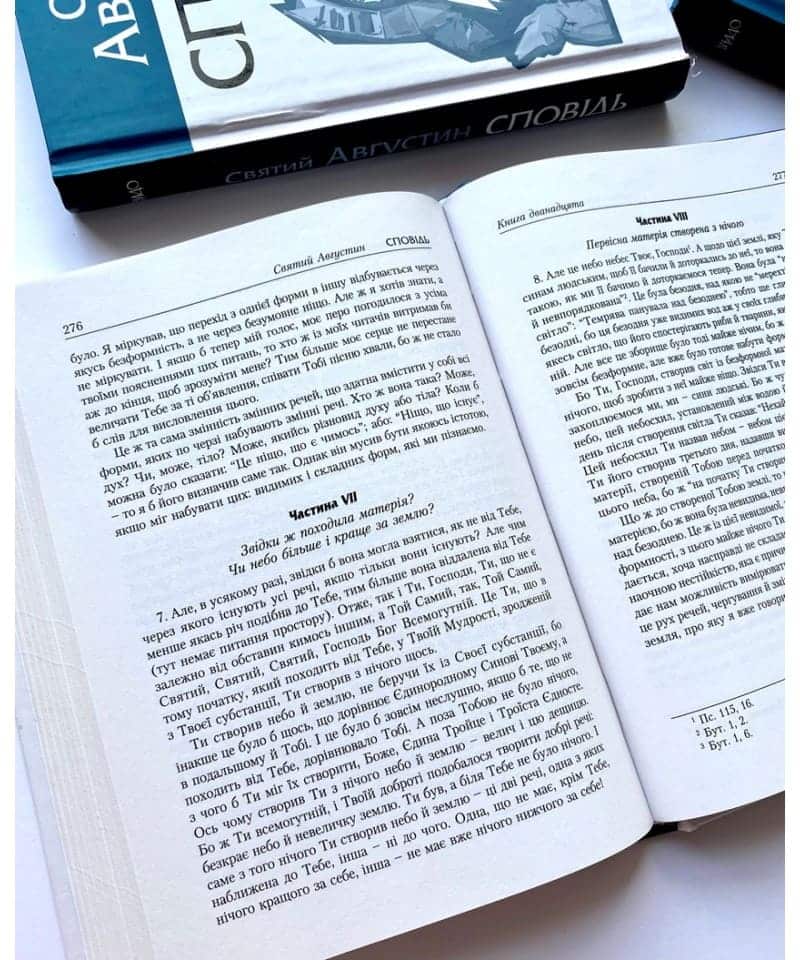 У своєму автобіографічному творі Святий Августин – християнський богослов, філософ й церковний діяч, видатний представник західної патристики – запрошує читача до спільної мандрівки лабіринтом роздумів і глибоко інтимних одкровень, щоб здійснити унікальне і особисте відкриття Божих істин.