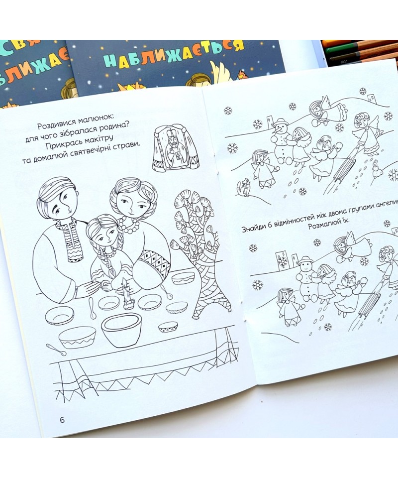 Пропонуємо розмальовку різдвяної тематики для дітей 4+ років. Окрім розмальовування ялинки, св Миколая тощо дітям запропоновані цікаві завдання: домалювати малюнок (за пунктиром) або намалювати свій; знайти на малюнку певні речі; знайти відмінності у двох схожих малюнках; розмалювати різними кольорами кульки на ялинці, що мають різну форму, та інші.