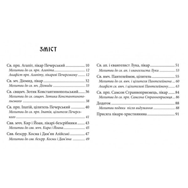 Формат: 105х145У запропонованому молитовнику розповідається про святих, що у своєму земному житті були лікарями, а також вміщено молитви та акафісти до них. Видання призначене для медичних капеланів, медиків, пацієнтів та їхніх рідних, а також для всіх, хто у душевному стражданні й тілесному терпінні потребує молитовної підтримки.