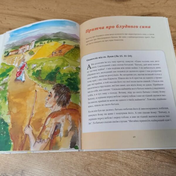 Книжка великого формат. У ній знайдеш 38 найважливіших уривків із чотирьох Євангелій. Доповненням Євангелії стали кольорові повносторінкові ілюстрації. Також всередині містяться рисунки, які полегшують розуміння текстів та мапи Святої землі і Римської імперії. До кожного уривку з Євангелії додано вступ-пояснення, а між умовними розділами додано додаткову цікаву інформацію про Євангелії.Отож, ця книжка:для дітей, які нещодавно навчились читати;для батьків, які хочуть навчити дітей читати Євангеліє;катехитів, які потребують невеличкої допомоги у викладанні.У цій версії книжка має тверду обкладинку, золоте тиснення променів та виділений заголовок, що позиціонує книжку як гарний подарунок для дитини.