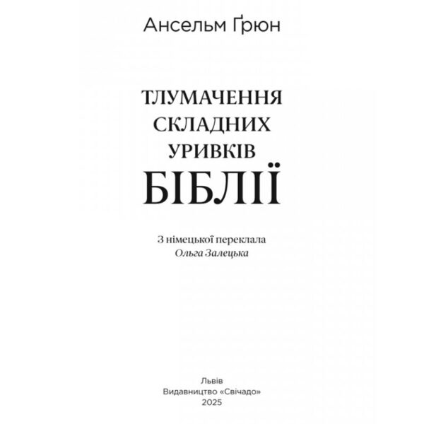 Ця книжка відомого духовного автора, монаха-венедиктинця Ансельма Ґрюна відкриває читачеві шлях до осмислення складних для багатьох людей уривків Святого Письма. Автор не уникає гострих тем — жорстоких епізодів Старого Завіту, провокативних висловів Ісуса, суперечливих місць апостольських послань. Ґрюн показує, що справжнє тлумачення неможливе без внутрішнього діалогу з текстом, чесності перед собою та готовности зустріти власні страхи, сумніви й рани.У цій книжці Ансельм Ґрюн веде нас у подорож крізь складні й багатьом незрозумілі сторінки Святого Письма — від історії Каїна та Авеля до притч Ісуса, які викликають подив і навіть спротив. Це не сухий богословський трактат, а жива духовна розмова, яка допоможе кожному відкрити глибину Божого слова й знайти в ньому внутрішнє зцілення.Ансельм Ґрюн — автор понад 300 книг, присвячених духовності, психотерапії, життєвим кризам, лідерству, емоціям. Його твори перекладено на понад 30 мов. Їхній загальний наклад — понад 15 мільйонів примірників.