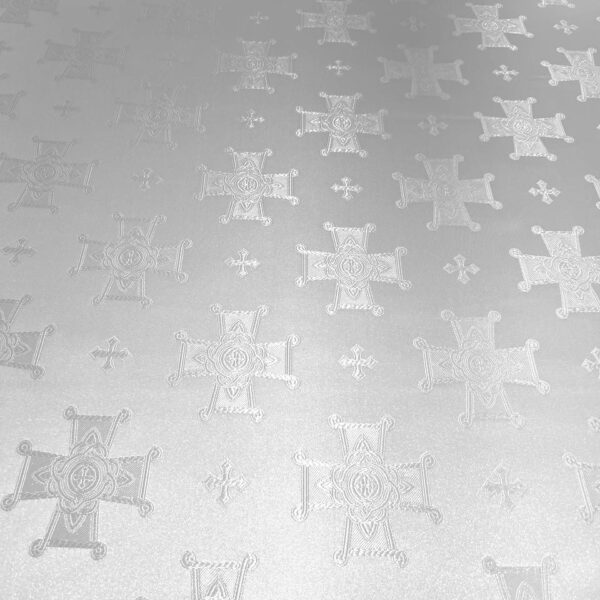 Шовкова тканина церковної тематики - Хрест поліставрій білий із золотом.Ширина полотна 1,6 м., Щільність 420г. метр погонний.Ширина рапорту – 3,5см., кількість малюнків на ширину тканини – 46.
